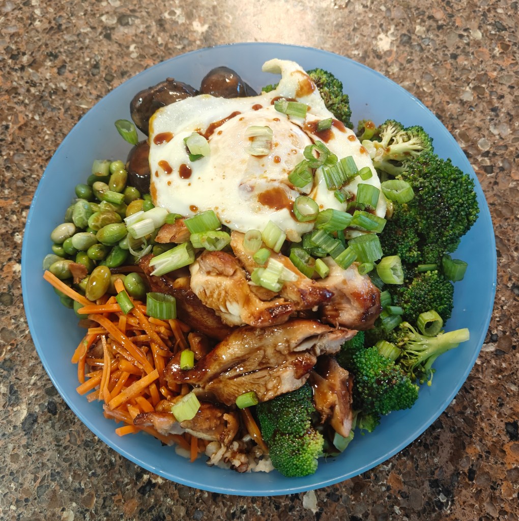 - To serve, scoop rice into bowls, top with chicken and veggies, spoon extra sauce over, and crown each bowl with an egg. Finish with sesame seeds, green onions, or a squiggle of sriracha if you’re feeling bold.